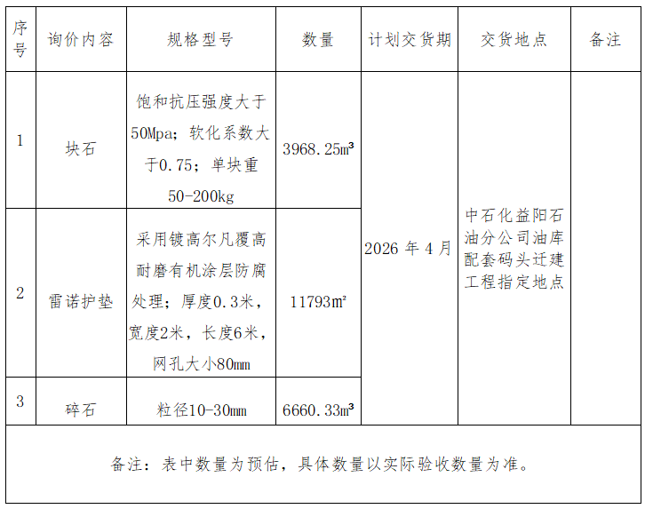 1、本次询价项目为湖南省航务工程有限公司中石化益阳石油分公司油库配套码头迁建工程护坡材料采购。