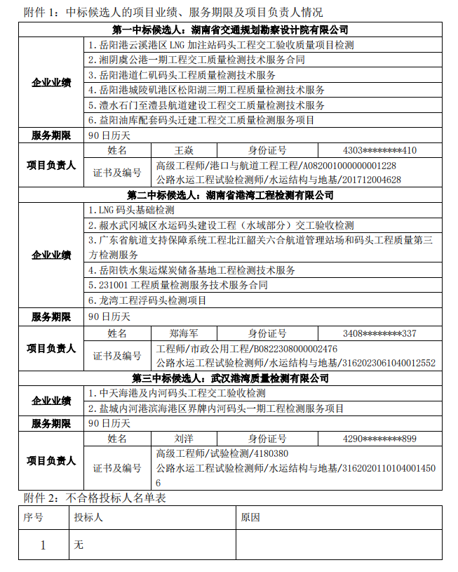 招标人湖南省水运建设投资集团有限公司对沅水常德至鲇鱼口2000吨级航道建设工程项目黄茅洲及漉湖航道处工作码头交工质量检测技术服务(招标编号:CNHD-XJ03)进行公开招标,评标委员会经过认真、细致的评审,推荐的中标候选人公示如下: