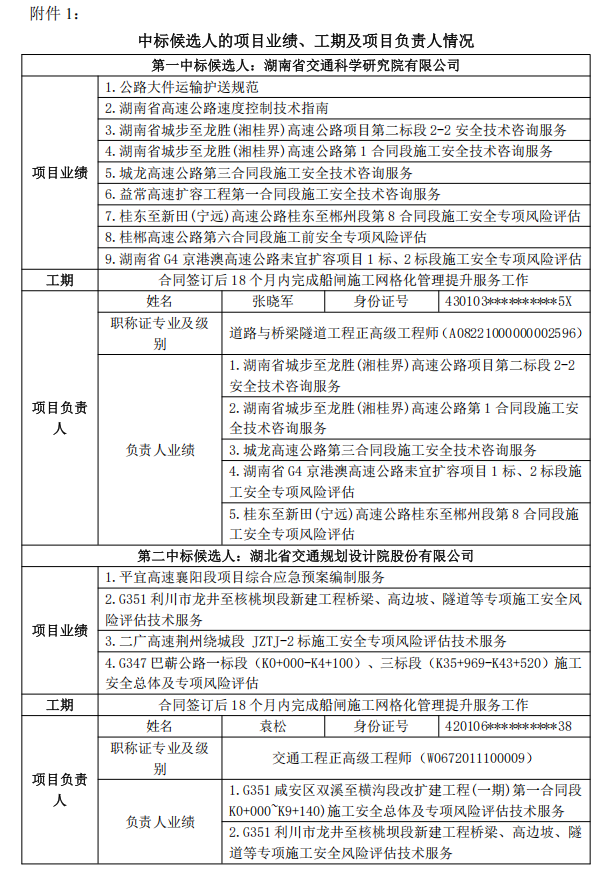 附件1:中标候选人的项目业绩、工期及项目负责人情况