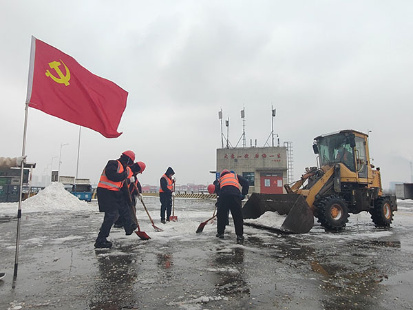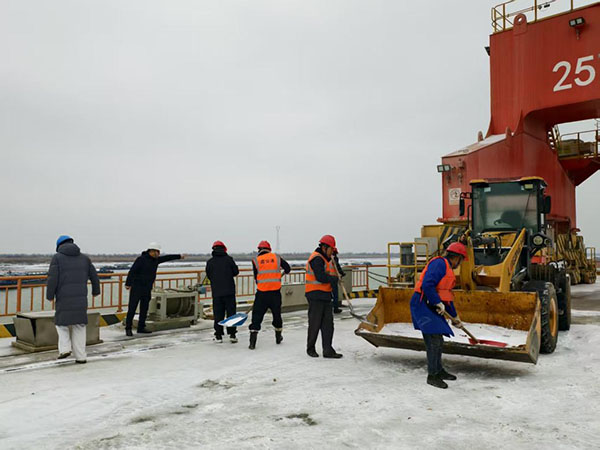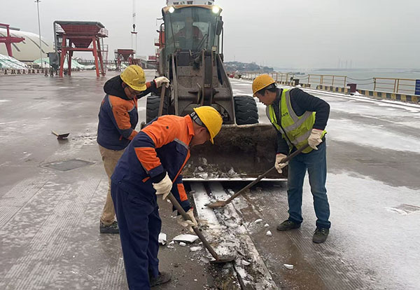 一方面部署防风、防冻、防滑、除雪等措施,全面清点并补充工业盐、防滑垫、除雪工具等应急物资,严格执行“关、停、撤、转”等刚性措施,科学调整作业计划。另一方面由党员、团员、青年职工组成的突击队,对主干道、闸口、堆场、上下引桥、码头前沿等重点区域展开除雪铲冰作业,生产区主要通道全面恢复畅通。