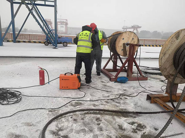 1月20日下午2点,经过5小时连续奋战,港产科技公司顺利完成虞公港1号门机闭合钢丝绳更换并交付使用。