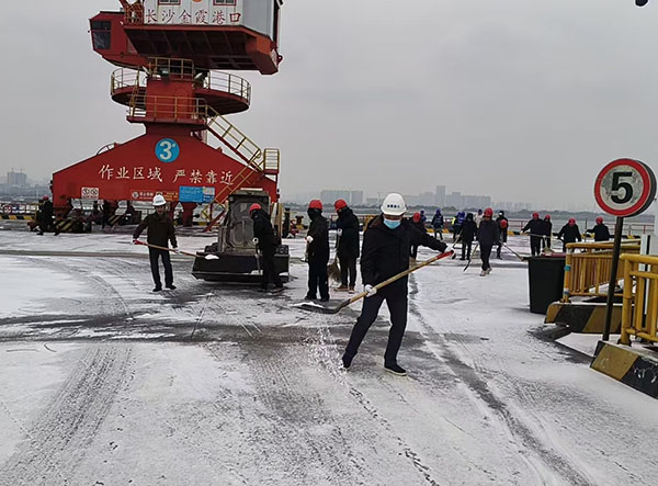 长沙金霞港口公司全体干部职工对作业区、主干道等重点区域的积雪积冰进行“地毯式”清理,保障港口道路畅通无阻和作业现场安全有序。同时,公司严格执行24小时应急值班制度,通过内部渠道及时发布天气预警,确保指令上传下达畅通,为快速响应冰雪天气筑牢保障。