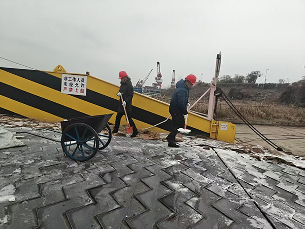 为防止路面及作业区域结冰湿滑,确保人员、车辆及设备安全,虞公港公司组织应急队伍,第一时间对上下游平台所有下船通道、引桥、转弯处等关键路段进行工业盐撒布作业,加速冰雪融化,从源头上降低结冰风险。针对起重机、龙门吊等各类特种设备的行走轨道、爬梯、操作平台,以及所有员工及作业人员必经的通道,铺设防滑麻袋和草垫,最大限度消除滑倒、跌落等安全隐患。同时加强对特种设备的巡检和维护频次,重点检查设备润滑系统、制动装置及钢结构在低温下的状态,确保其性能完好,运行可靠;24小时密切监控天气变化与作业现场动态,科学调配生产资源,在保障安全的前提下,努力提升作业效率。
