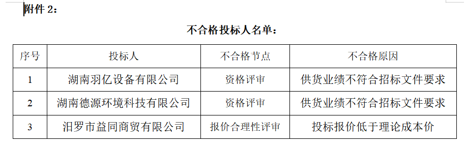 2)湖南德源环境科技有限公司(不合格原因:供货业绩不符合招标文件要求)
