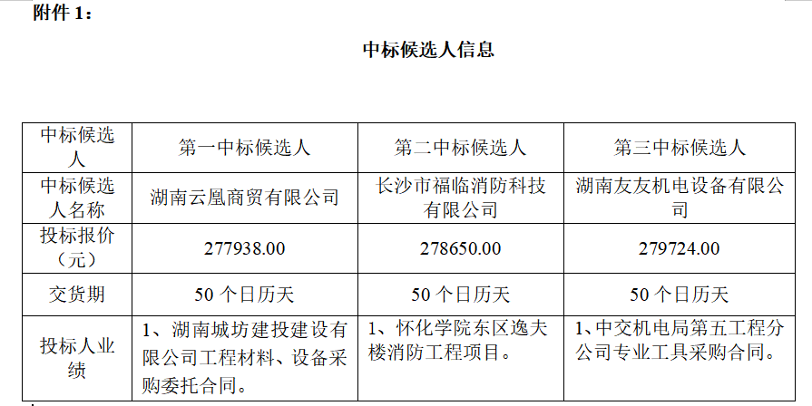 第一中标候选人:湖南云凰商贸有限公司(投标报价:277938.00元)