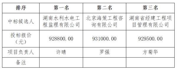 本招标项目湖南省资水犬木塘水库工程临时用地复垦施工监理,招标人为湖南省水利发展投资有限公司犬木塘水库建设分公司,招标项目资金来自中央和地方财政资金。根据招标投标相关法律法规及招标文件的规定,本项目于2025年10月20日9时00分,在湖南长沙市天心区新姚南路196号港航水利集团609室依法开标,评标办法采用综合评估法,评标委员会全体成员对投标人递交的投标文件按照相关法律法规和招标文件的要求进行评审,推荐了以下中标候选人(排序),现将相关信息予以公示:
