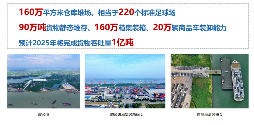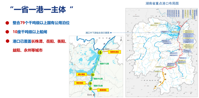 近年来,在省委、省政府高位推动下,在省交通运输厅、省财政厅、省国资委、省发改委等部门大力支持下,在市县政府全力配合下,港航水利集团以“一省一港一主体”整合79个千吨级以上省属国有公用泊位。目前,集团港口已覆盖长株潭、岳阳、衡阳、益阳、永州等重点城市,通过疏港公路、铁路专用线有效衔接岳阳、长沙等港口,形成了上下游高效联通,“一湖四水”有效联动,公铁水无缝衔接的港航基础设施服务网,打造了“城陵矶港”统一品牌,树立了“湖南省优质服务标杆”,全力支撑“4×4”现代产业体系发展壮大。同时,集团正在加快建设松阳湖、虞公港等一批现代化港口码头。