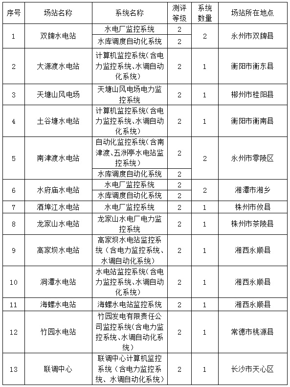 (1)11个水电站、1个风电场、1个联调中心的信息安全等级保护测评工作。共16个系统安全等级保护测评工作。详见下表: