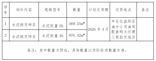 1、本次询价项目为湖南省航务工程有限公司中石化益阳石油分公司油库配套码头迁建工程水泥稳定碎石材料采购。