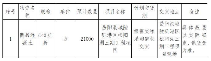 1、本次招标项目为湖南省航务工程有限公司岳阳港城陵矶港区松阳湖三期工程项目商品混凝土采购。