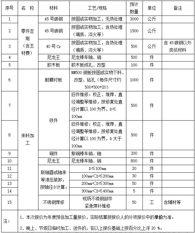 1.5 采购项目概况: 岳阳城陵矶港务有限责任公司码头设备使用率高、磨损件多,日常维修中临时需要应急机械加工零件,主要为机加工、开孔、钢材热处理等工艺。该项目对供应商响应时效要求较高,存在连夜赶制、即来即取的情况,且每次数量不多,单件加工为主。以下数据为估计量,不作为结算依据,具体按实际加工量和成交单价结算。报价人可以自行进行市场考察综合预判,风险收益自担。