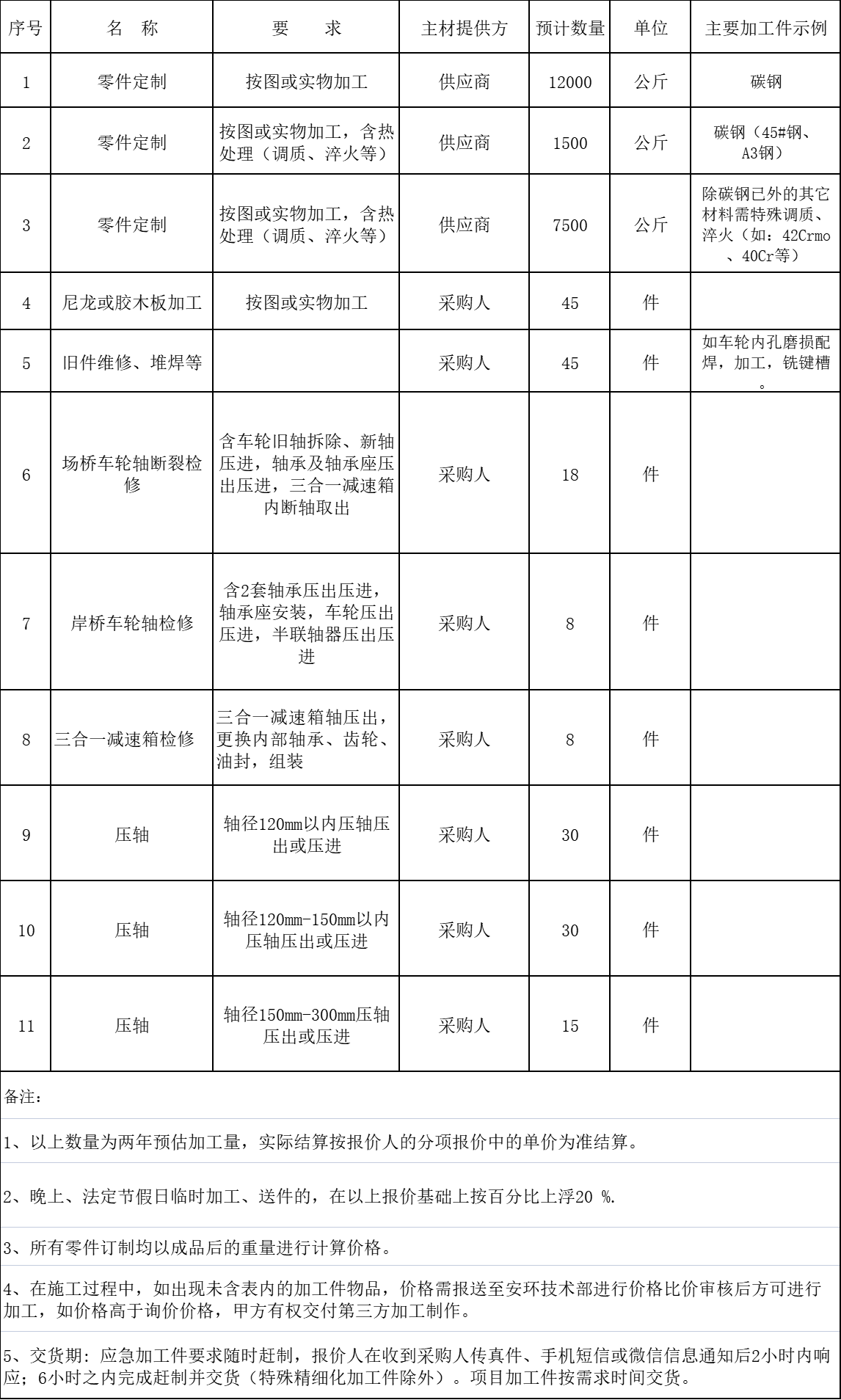 1.5 采购项目概况: 湖南港产科技有限公司主要负责集团内部设备维修及保养等工作,码头设备使用率高、磨损件多,日常维修中需要大量应急机械加工零件,设备大修项目中也需要进行零部件加工,主要为机加工、开孔、钢材热处理、压装轴等工艺。该项目对供应商响应时效要求较高,存在连夜赶制、即来即取的情况。