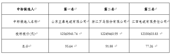 中技建设咨询有限公司受湖南省水利水电勘测设计规划研究总院有限公司的委托,代理湖南省资水金塘冲水库枢纽工程电缆及电缆附件采购招标,2026年4月27日9时00分在湖南省港航水利集团有限公司6楼609招投标室(湖南省长沙市天心区新姚南路196号)进行了公开开标,在湖南省水利水电勘测设计规划研究总院有限公司纪检审计部监督下,依法组建的评标委员会按照招标文件确定的评标原则和评标办法进行了细致的评审,并推荐本项目中标候选人排名如下:
